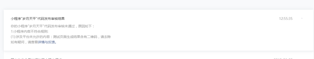 目前平台规则,测试类和游戏类小程序,不得含有二维码,请修改