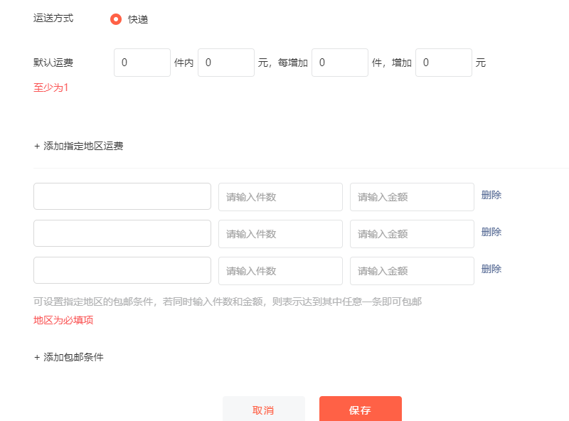 在现有的模板上的包邮条件选项上根本点不开呢,每点一次 包邮条件就在指定运费区间下面多跳出一个对话框,另外的尝试设置实在指定运费去区间里添加包邮逻辑,设置完全国省份,金额设定在50元,发现结账的时候 还是不行,如果哪里设置错了有没有高手指点一下呢!谢谢!