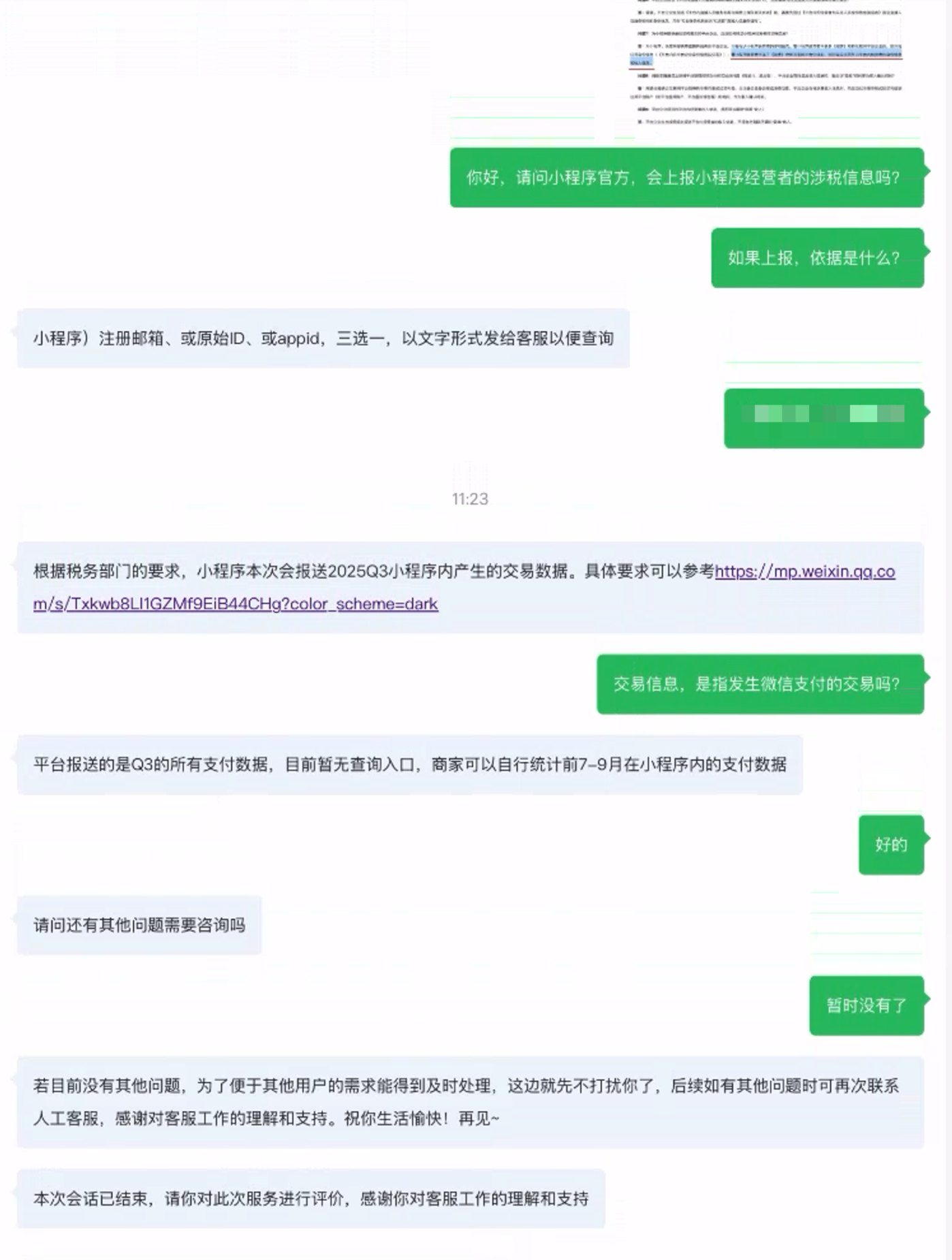 官方这个报送的是什么数据,目前不得而知,也没有地方查询,好多商家都陆续收到了税务局的短信提醒,还请官方及时给出回复,涉及报税不是儿戏,这样会搞死人的,以后谁还敢用微信小程序。