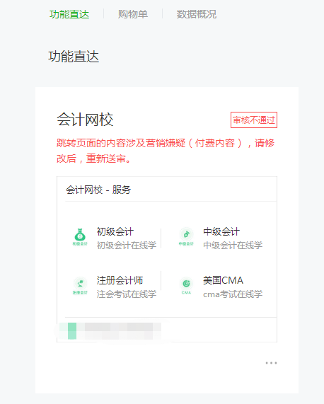 1、我们申请“功能直达”功能,但是审核未通过,不通过原因如下图。能否具体解释下