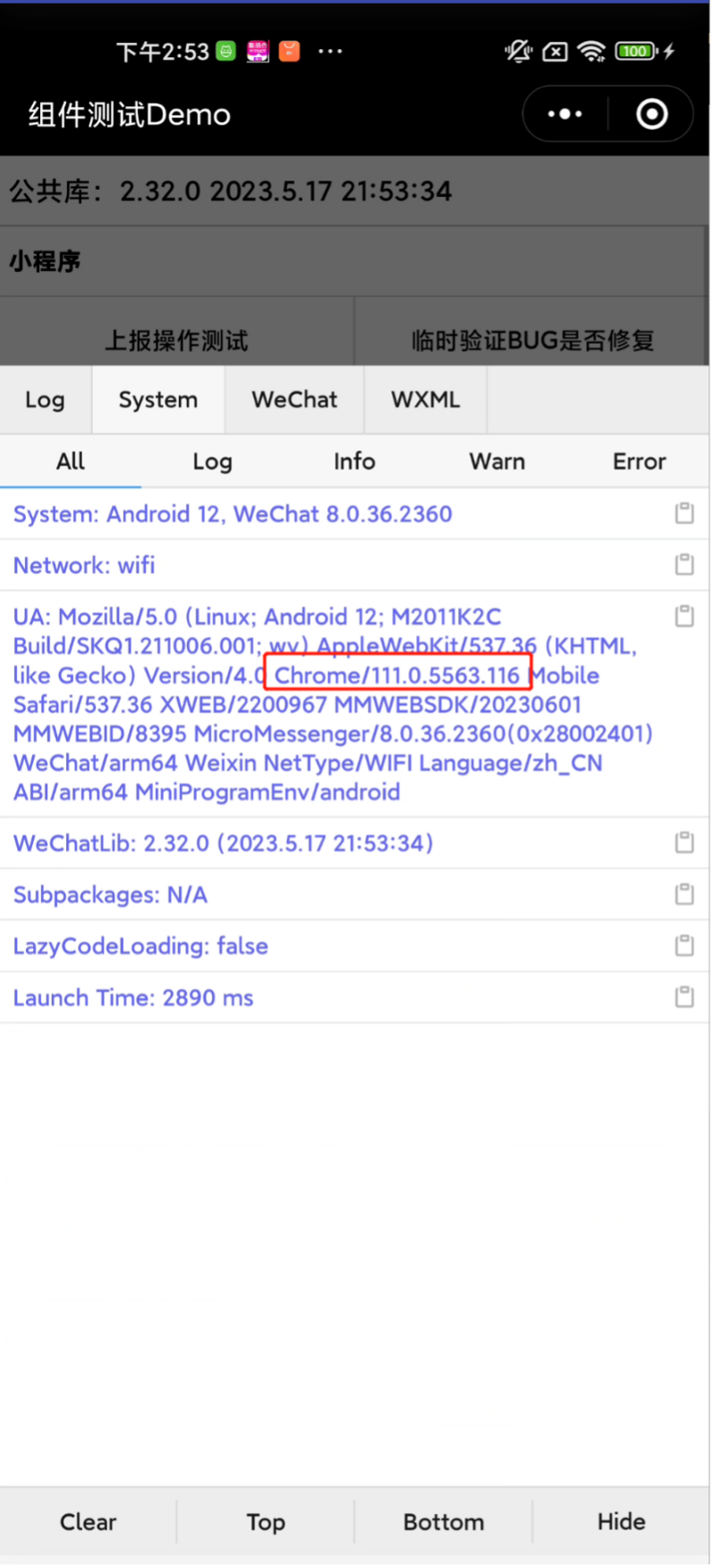 如果当前安卓微信 XWeb 111 内核版本遇到异常表现或者渲染相关的问题,可先查看 UserAgent 版本是否包含 Chrome/111.0.5563.116 来判断是否为 111 新内核,并在 小程序交流专区 发布标题含「安卓微信 XWeb 111 新内核」的帖子进行反馈。