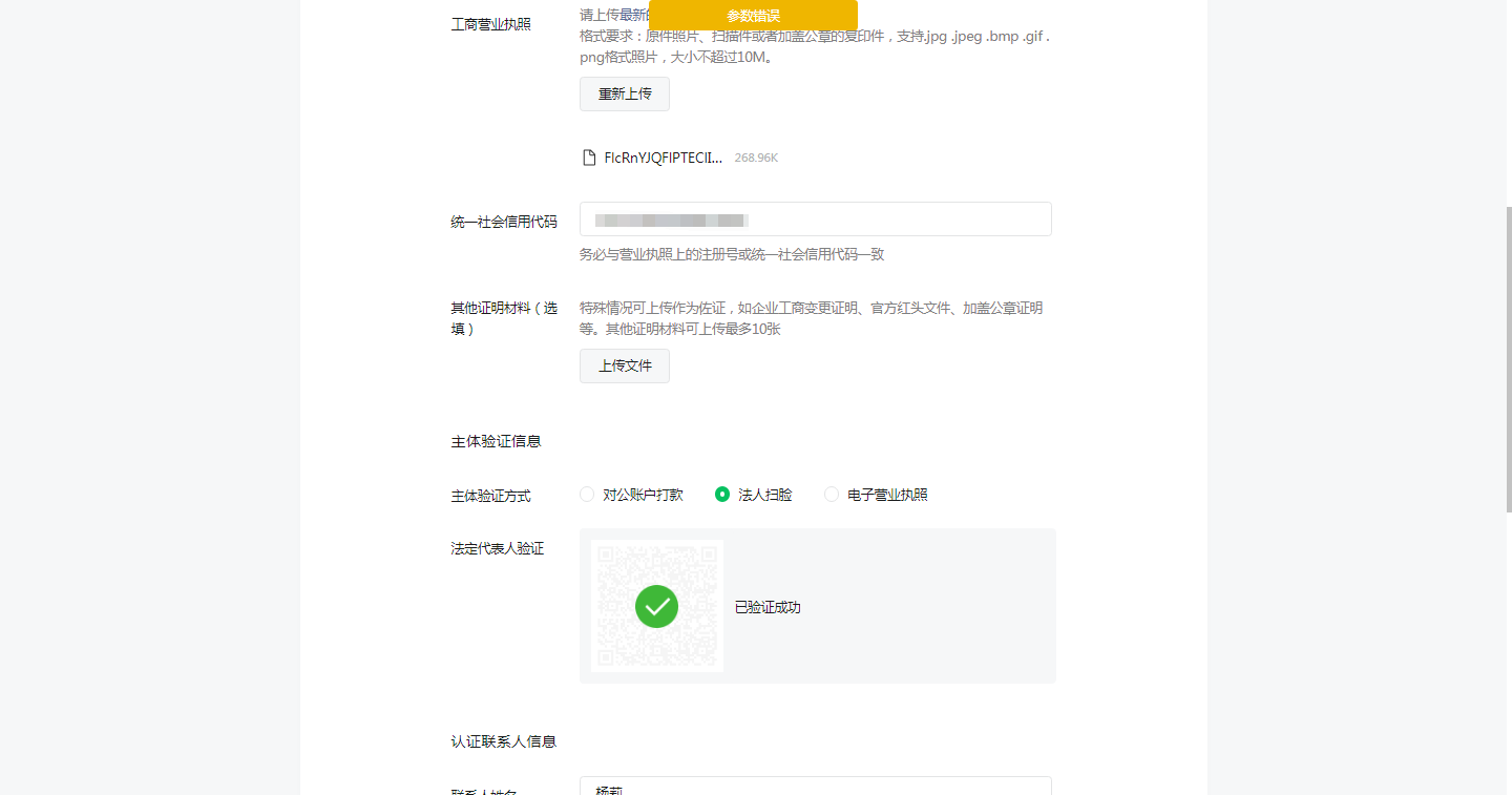 小程序认证被打回,重填提交后,提示参数错误