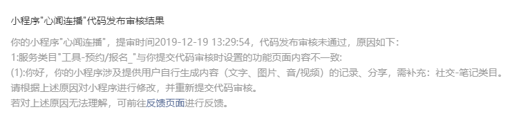 你好,经核实,你的小程序:1.涉及平台未允许的内容:付费算命、付费起名;2.2019-12-21,16:12提审版本确实涉及提供用户自行生成内容(文字、图片、音/视频)的记录、分享,需补充:社交-笔记类目。或请自查代码,确保包括前端展示、小程序代码等整体均移除:相关内容,再提交代码审核。(详图如下)