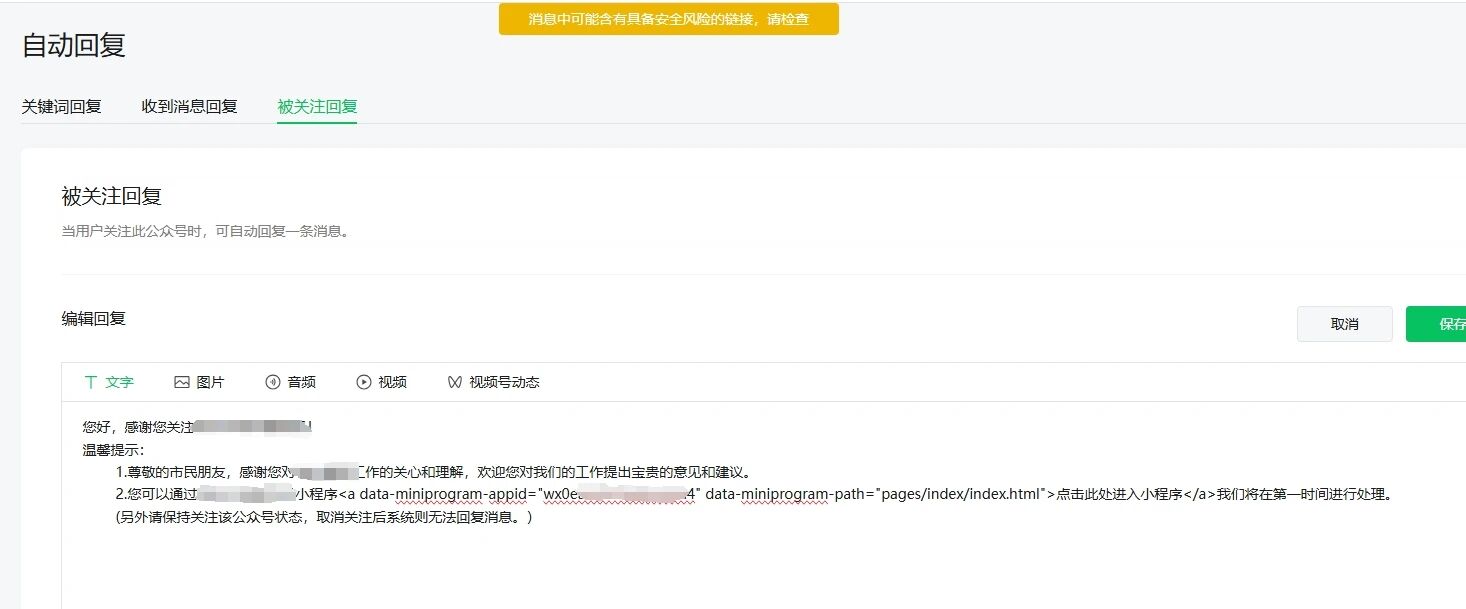 为什么自动回复不能插入小程序链接了?提示有风险?