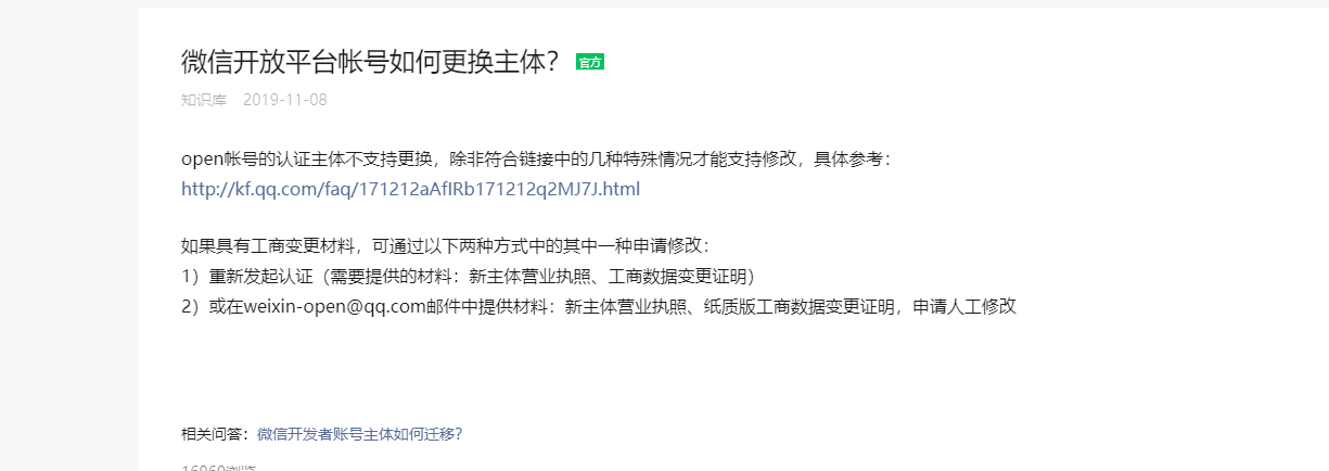 2)或在weixin-open@qq.com邮件中提供材料:新主体营业执照、纸质版工商数据变更证明,申请人工修改