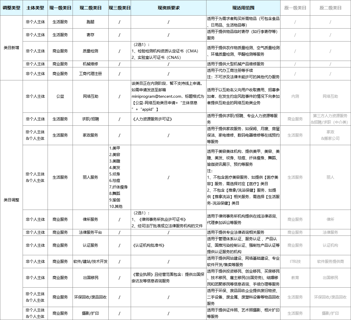为带来更好的类目申请体验,小程序类目规则正在持续优化中。本次调整主要涉及公益、生活服务、商业服务相关。