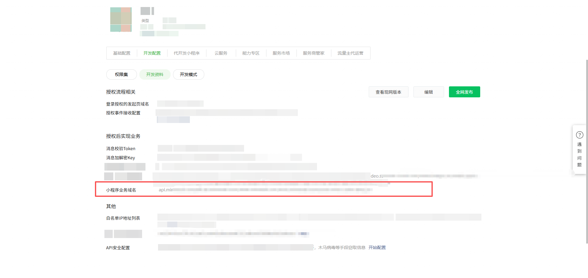 有没有在第三方平台中配置了这个业务域名?需要先配置才能给小程序配置。