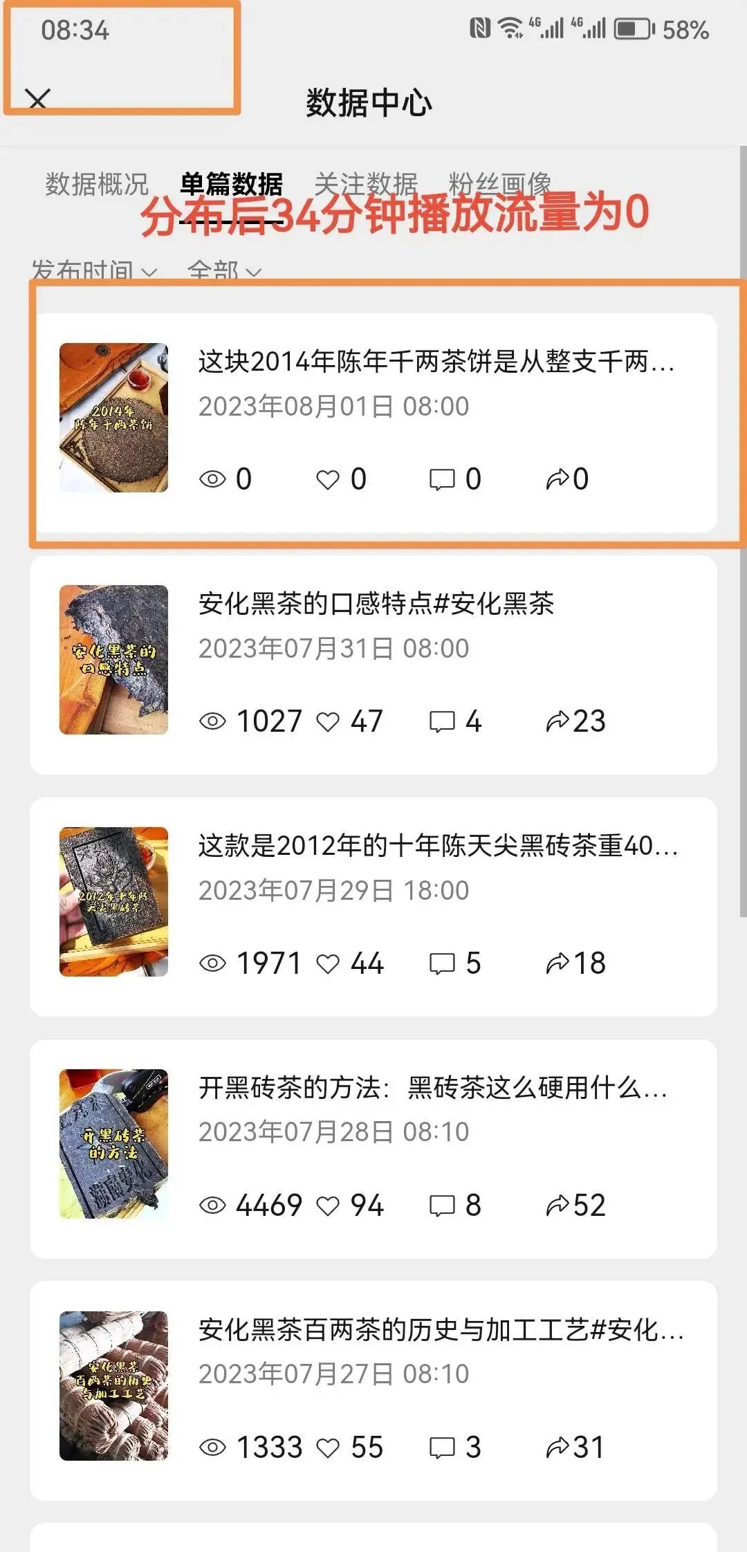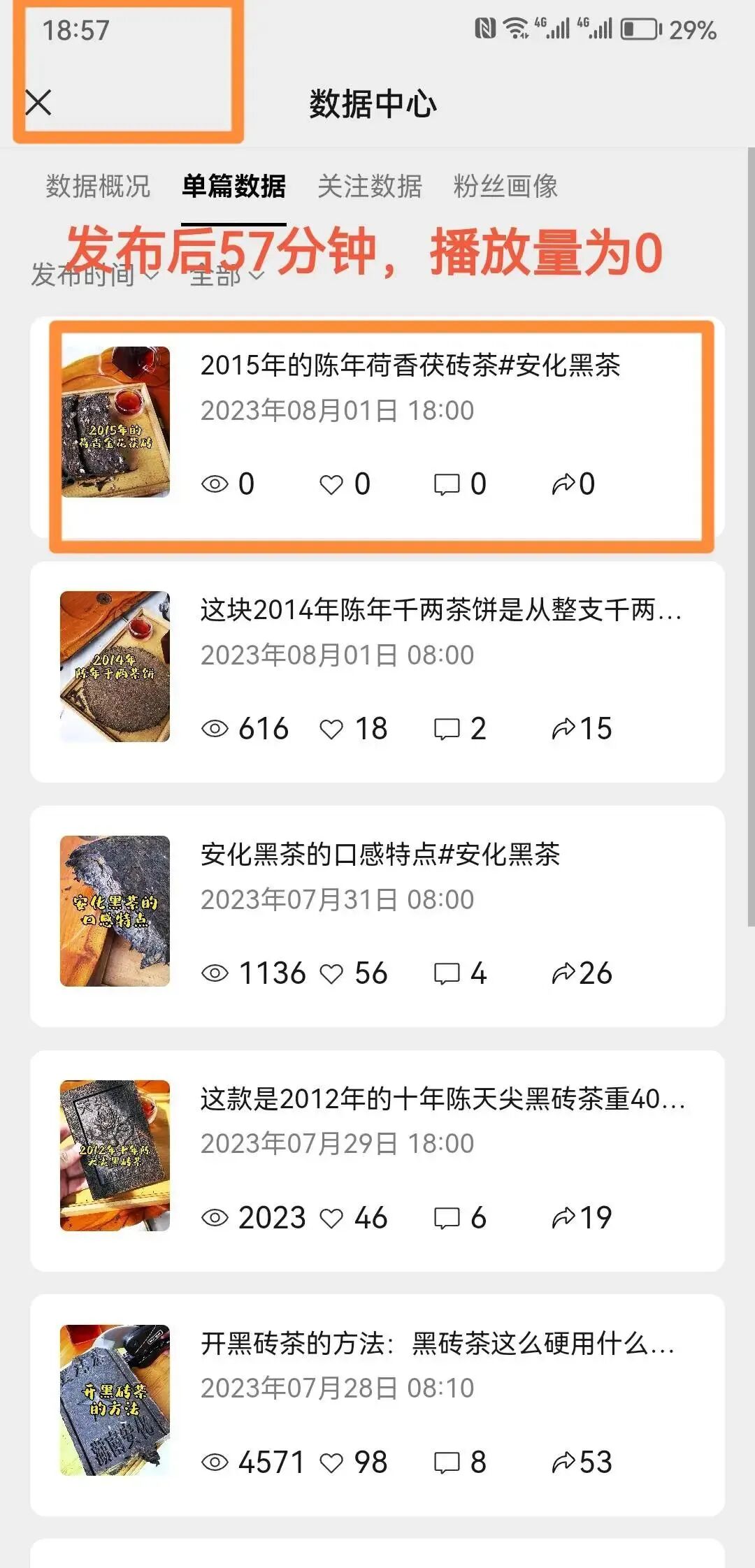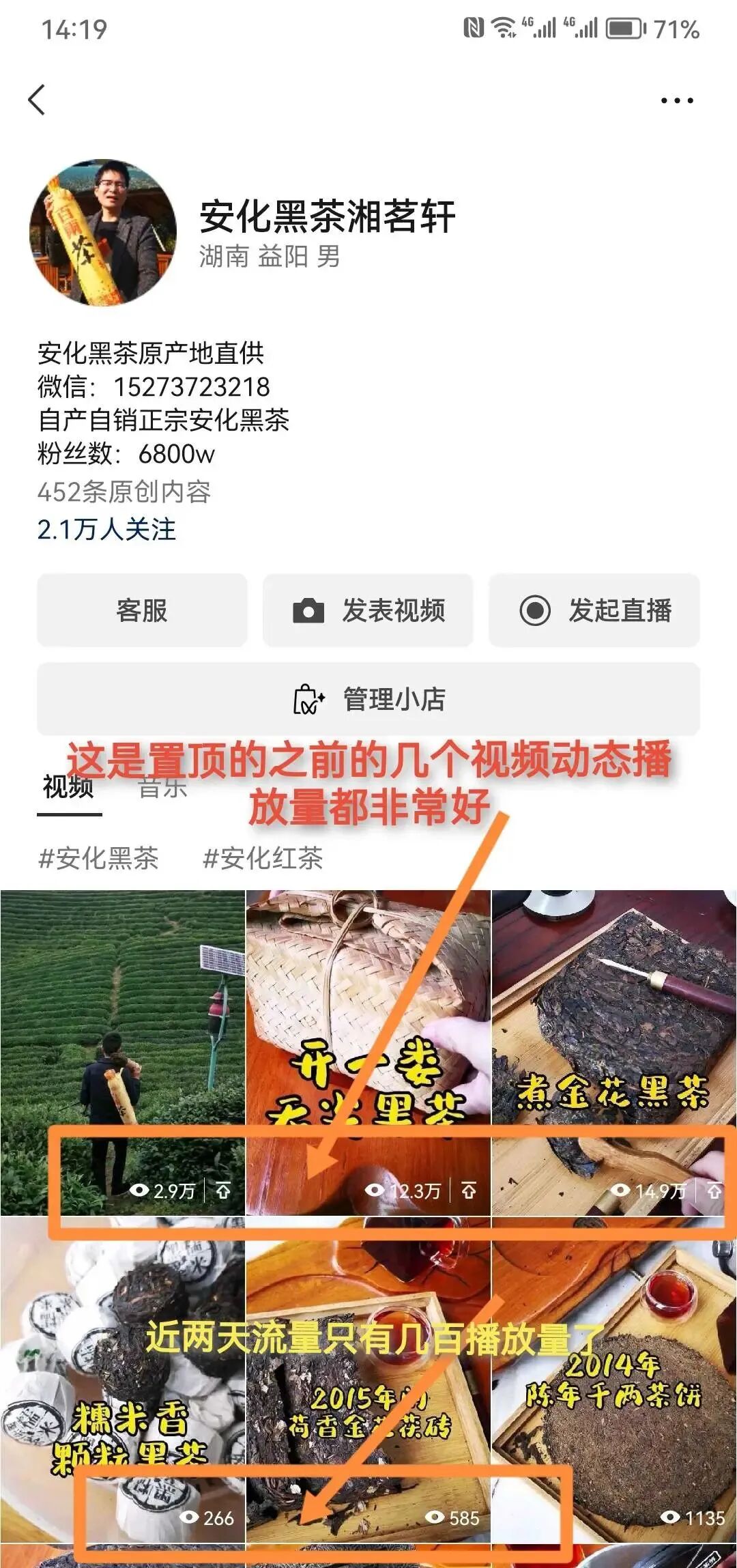 视频号:安化黑茶湘茗轩 视频号动态流量推荐异常,之前视频号动态发布后5分钟左右就有流量推荐,可是现在发布几十分钟,甚至一、二个小时都是显示播放量为0,之前每条作品可以累计上万播放量,甚至几十万播放量,现在只有几百播放量了。而且通过账号诊断查询显示:账号状态正常。