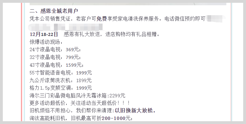 3、营销宣传内容:主要目的为推广、宣传和销售的内容,比如广告宣传、商家活动、单位招聘、投票征稿等内容。