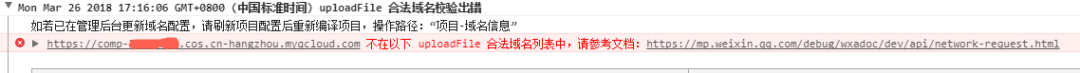 【描述】 1. 在小程序开发过程中,需要上传文件到阿里云,并且需要把 阿里云 oss 访问域名 添加到小程序服务器域名中,否则会报错(如图)
