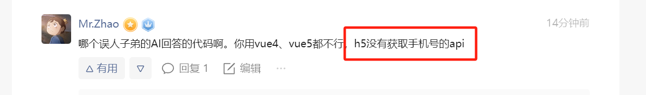 哪个误人子弟的AI回答的代码啊。你用vue4、vue5都不行,h5没有获取手机号的api