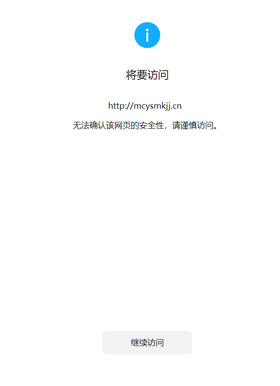 网站:mcysmkjj.cn微信内访问网站出现“无法确认该网页的安全性,请谨慎访问”的拦截提示,网站符合《微信外部链接内容管理规范》,腾讯安全网址安全中心检测网页没有不安全的内容,请求核实后解除在微信内的访问拦截提示,谢谢