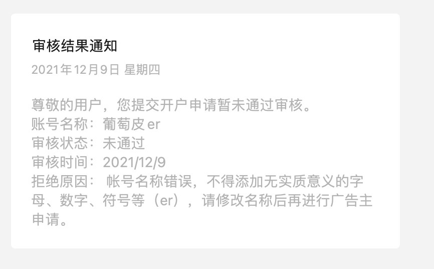我们之前的小程序名称叫“葡萄皮er”,开通广告主收到这样的提示后,我们重新花钱做了认证,将小程序的名称改成了“葡萄皮皮”,结果还是这样的审核结果,我的问题:1. 这里的账号名称和小程序的名称是一个意思吗?2. 如果是,我们已经修改了小程序的名称,为什么这里还没有改?3. 如果不是,这里的账号名称怎么修改?谢谢