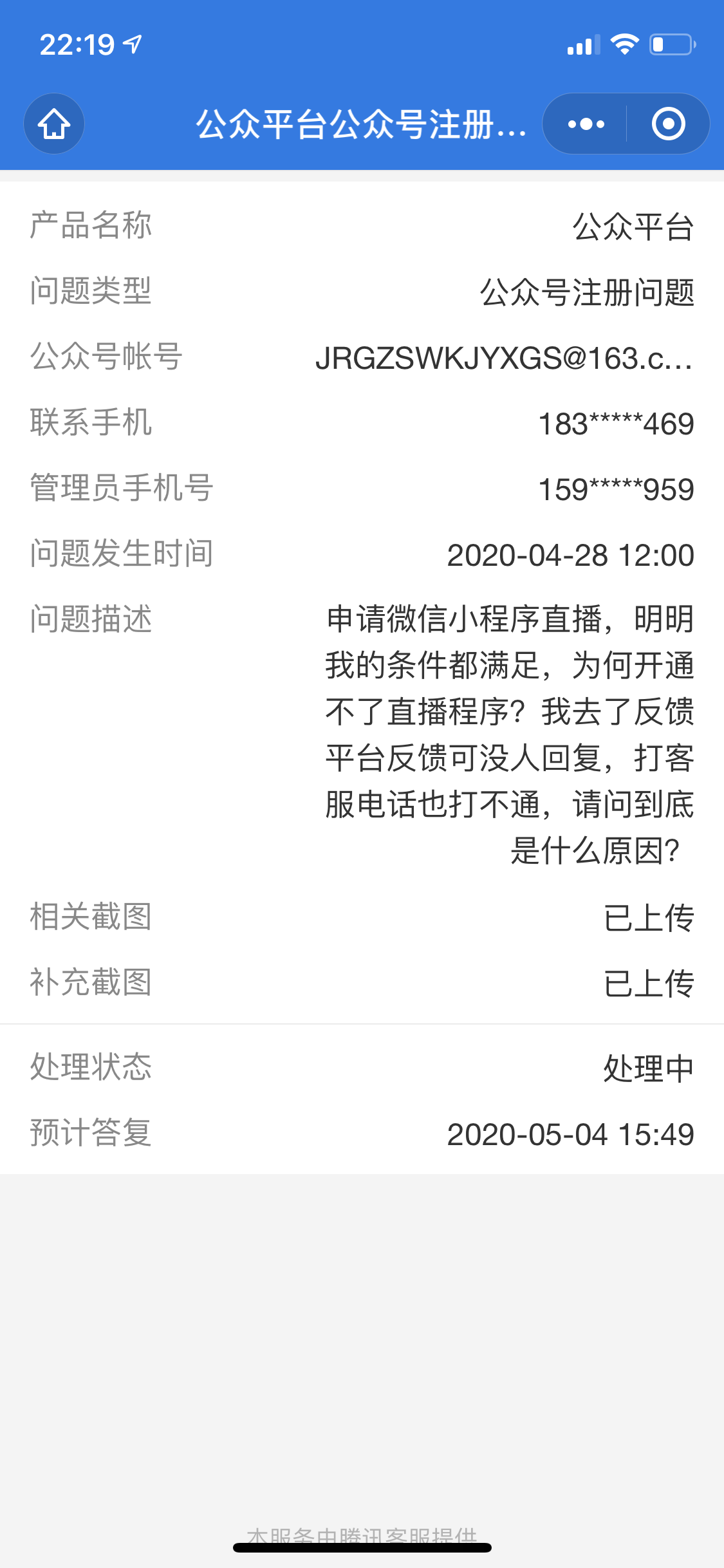 我们正在申请微信小程序直播,您给出的申请条件,我们都满足,但是现实无法申请。我打人工服务电话 打了很多天了一个都没接,上腾讯客服公众号反馈,说三日后会给出解决回复,但现在五天了还没得到任何回复。请问一下贵司这个问题到底如何处理??