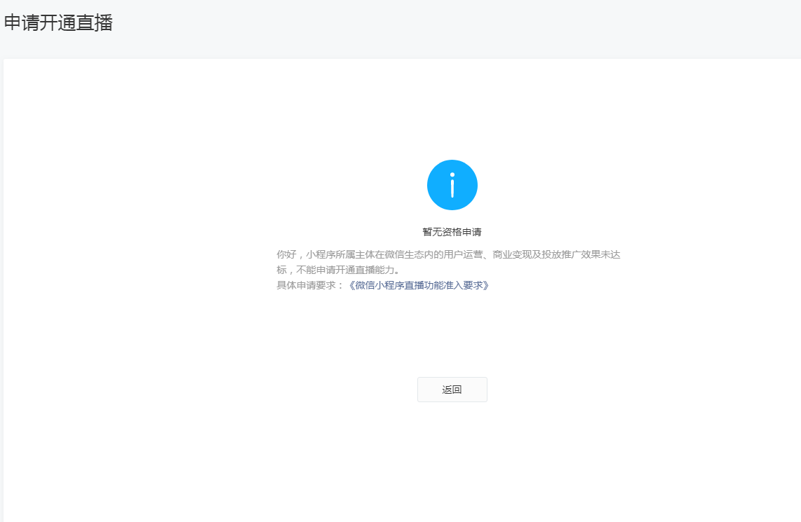 你好,经核实该小程序现已具备开通直播的能力,请重新申请开通。
