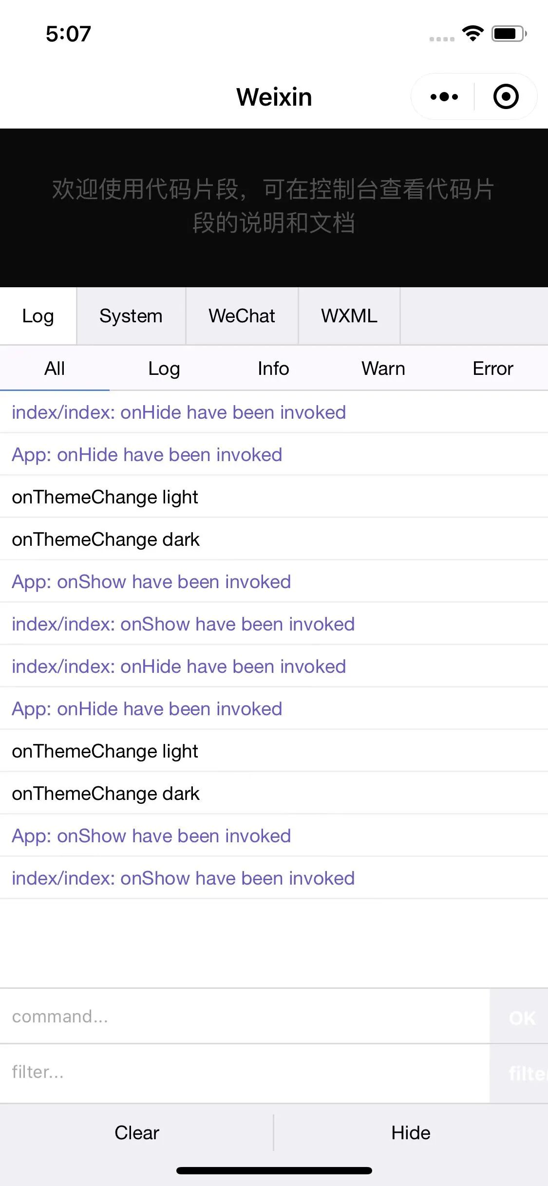 可以看到控制台中打印了两条 onThemeChange,且两条的内容不一致,实际上截图的手机正处于 dark 模式下