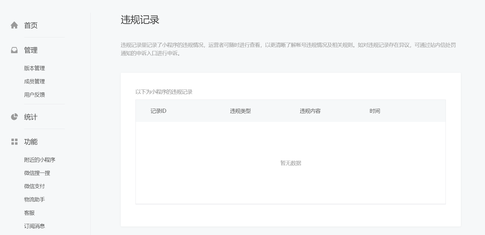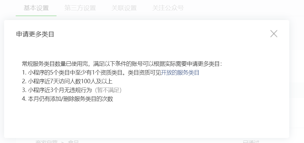 之前有提示违规,后面申诉了,并且小程序个人中心左侧“违规记录”并没有提示有违规记录,但是在新增类目的时候提示 【近三个月有违规记录】导致无法新增类目