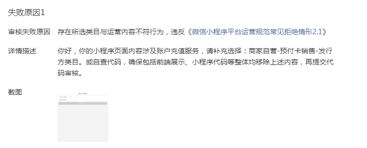 你好,你的小程序页面内容涉及账户充值服务,请补充选择:商家自营-预付卡销售-发行方类目。或自查代码,确保包括前端展示、小程序代码等整体均移除上述内容,再提交代码审核。