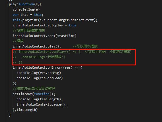 第一次点击播放触发onPlay()事件,控制台打印出开始播放,然后播放事件里面有计时器在几秒之后就已经innerAudioContext.pause();暂停了,再次点击进行播放的时候监听不到了吗?(有设置的开始时间节点) 在控制台里面也没有打印出监听事件里面的"开始播放"文字。