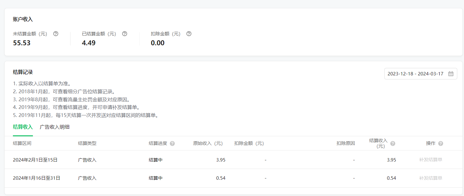 查询1月下半月和2月上半月结算单已于这两日补结完成,请核查结算邮箱收信记录。个人账号腾讯公司会在您收到结算单后的15个工作日内自动将税后金额支付至您的结算银行卡,请后续留意下结算进度更新状态及银行卡到账情况。