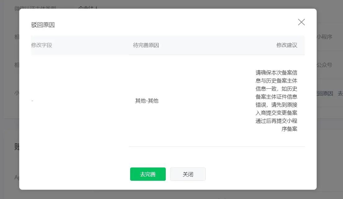 小程序20年认证的,去年7月企业法定代表人就变更,其他信息不变,这几天小程序备案,初审通过,但是被管局驳回,驳回原因是“请确保本次备案信息与历史备案主体信息一致,如历史备案主体证件信息错误,请先到原接入商提交变更备案通过后再提交小程序备案”,这接下来怎么搞呢,有同样问题并已解决了的么?