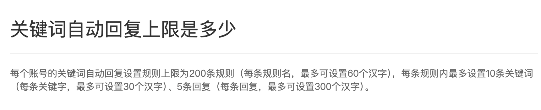 目前关键词自动回复规则数量上限为200条:https://kf.qq.com/faq/120322fu63YV130422uuIrIr.html