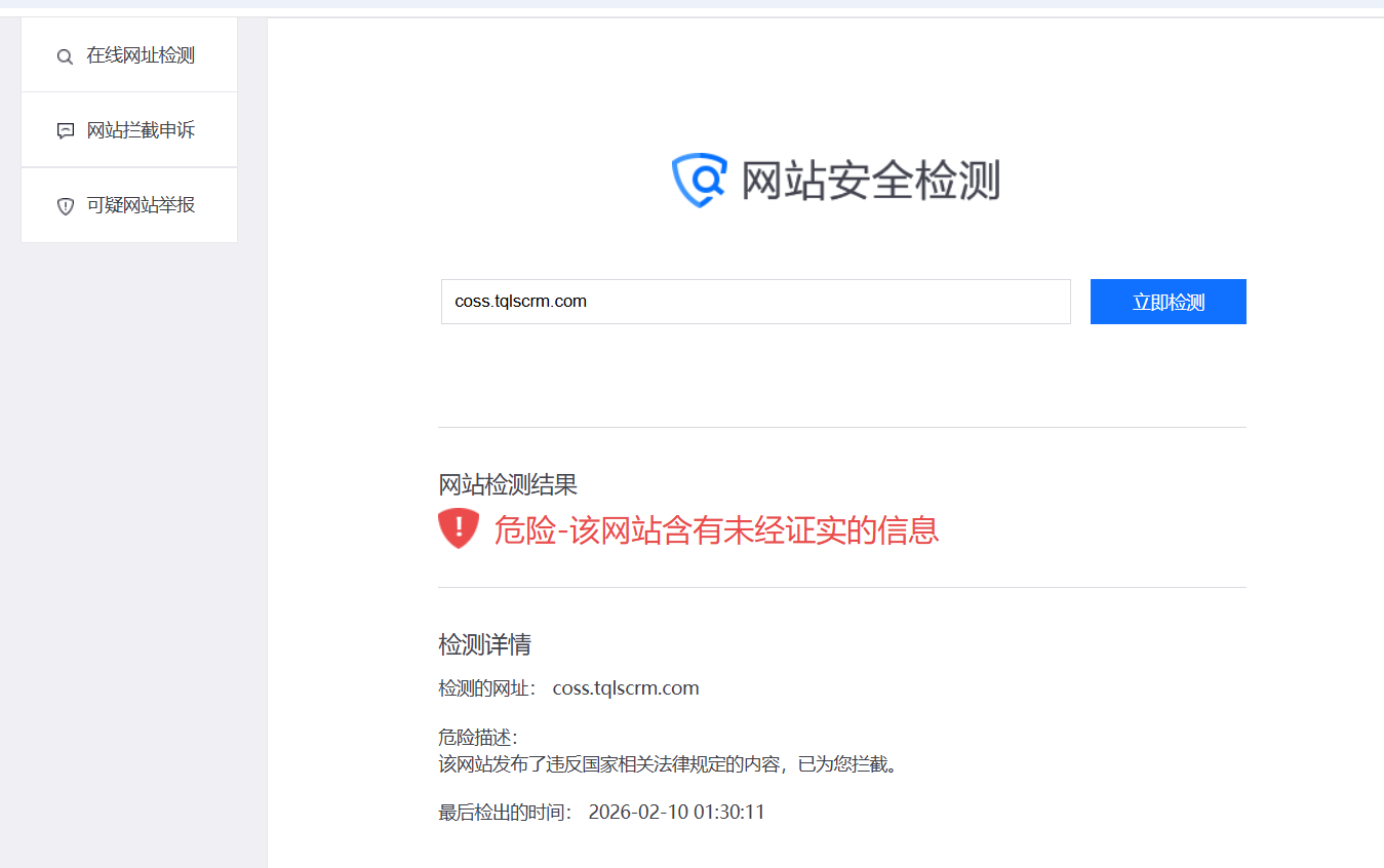 你好,经核实,域coss.tqlscrm.com被手机管家拦截,此处只处理被微信暂停提供微信内直接访问的服务的外部链接的申诉问题,建议登录手机管家官网【http://gj.qq.com/online_server/complain_url.html】自行申诉,知悉。