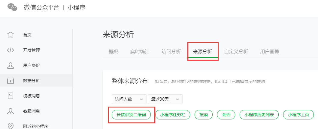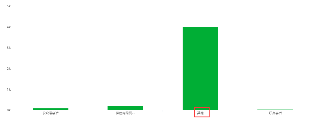 长按识别二维码”上层来源分布,其中的“其他”指公众号会话、微信内网页、朋友圈、好友会话以外的场景,经核实此帐号是从其他小程序内二维码长按识别打开,后续平台把这个场景拆分展示出来。