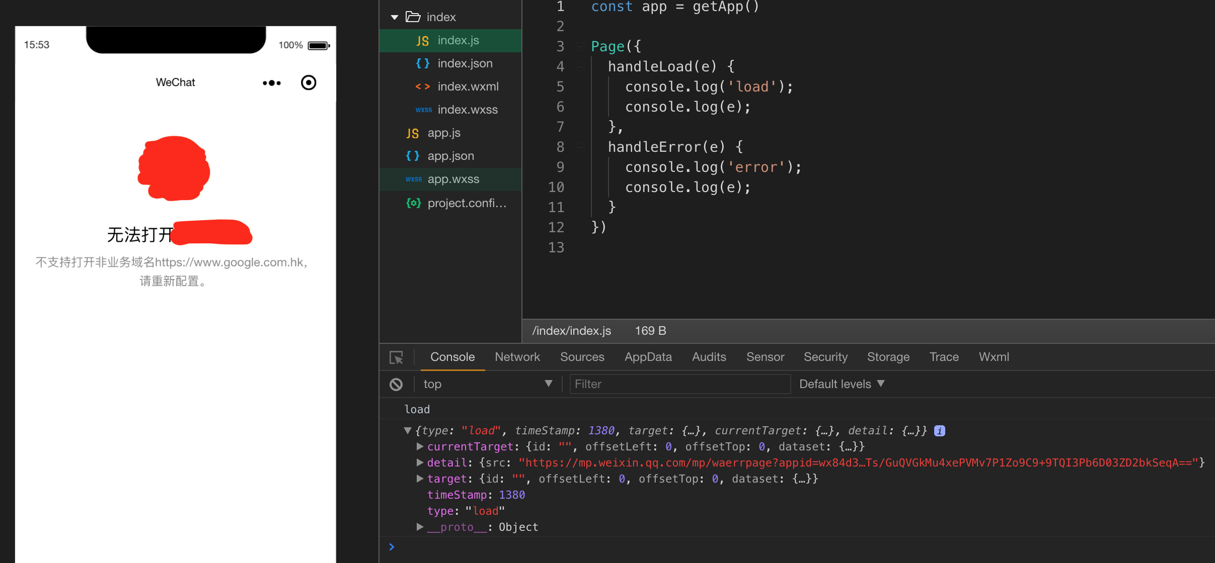 通过调试发现,打开非业务域名时,会加载一个url为“https://mp.weixin.qq.com/mp/waerrpage”开头的页面,也会触发bindload事件