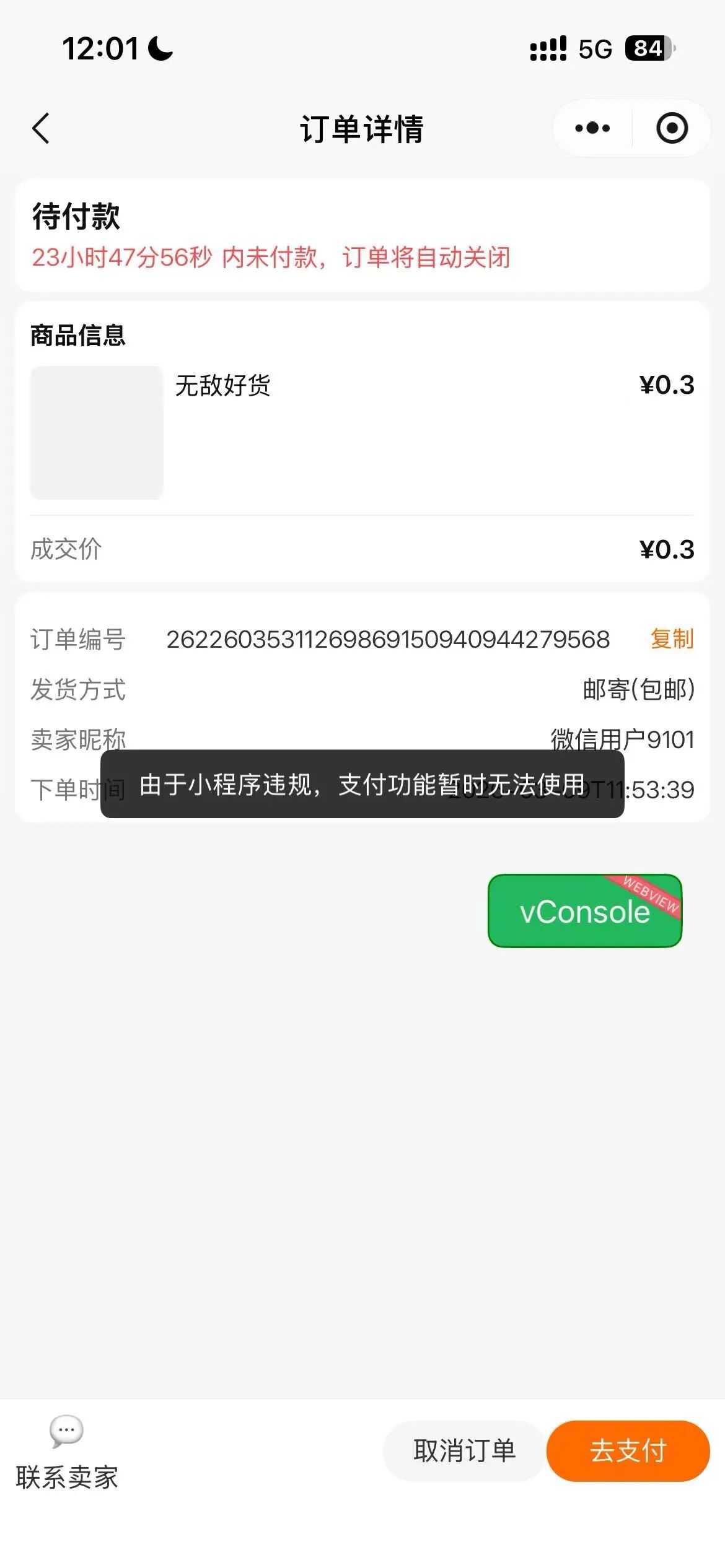 后端请求接口获取唤起支付内容,前端唤起支付弹框说小程序违规。但是,通知中心没有任何的告知等。请问是什么原因