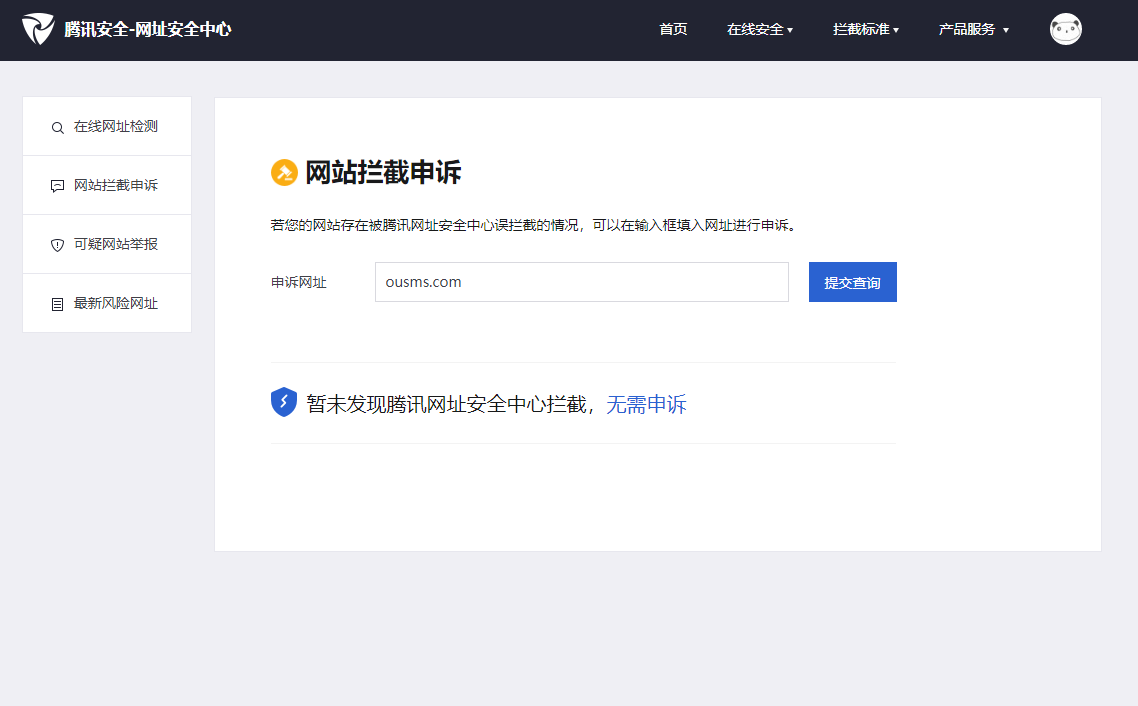 另外根据之前的问答帖,在腾讯安全-网址安全中心,查询后提示:暂未发现腾讯网址安全中心拦截,无需申诉!