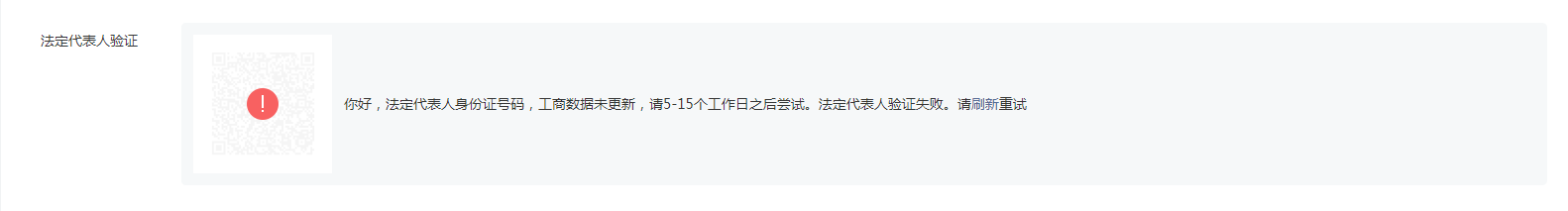 你好,法定代表人身份证号码,工商数据未更新,请5-15个工作日之后尝试。法定代表人验证失败, 我的营业执照是这个月16号办下来的 最近认证好多次都是这个情况 , 要怎么办呢?