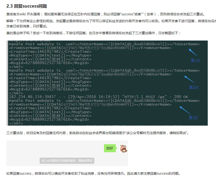 我这里确实是接受到了消息推送 我该怎么给微信回复,现在这样回复会在公众号提示"该公众号提供的服务出现故障,请稍后再试"