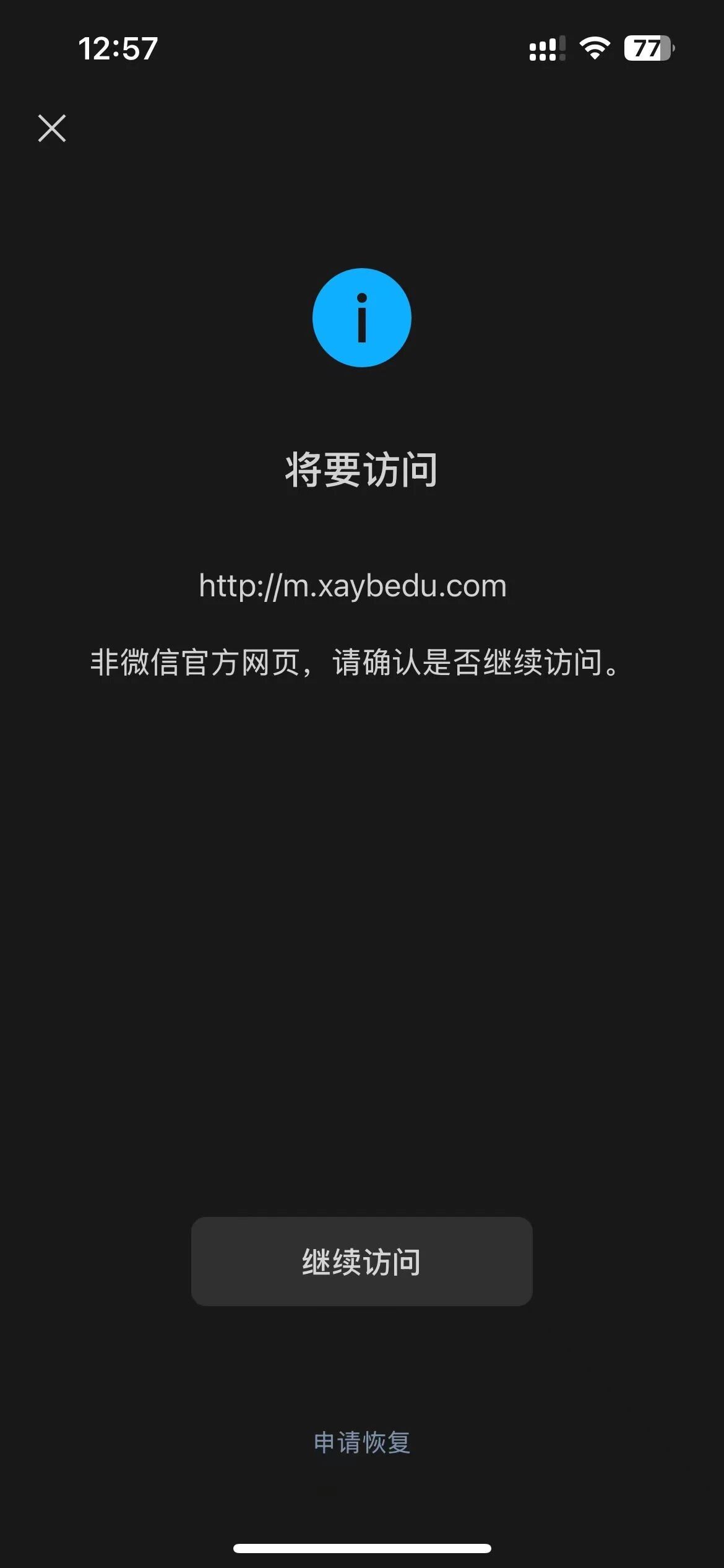 好,域名m.xaybedu.com在西部数码注册并通过优刻得备案通过,http://m.xaybedu.com/浏览器访问正常,我是网站开发者,访问时间如图2025/10/11,点开网址提示“非微信官方网页,请确认是否继续访问。”经检查网页里没有不安全的内容,请核实后帮忙解除拦截,谢谢!尽快处理,急急急,现在需要打开使用,谢谢啦