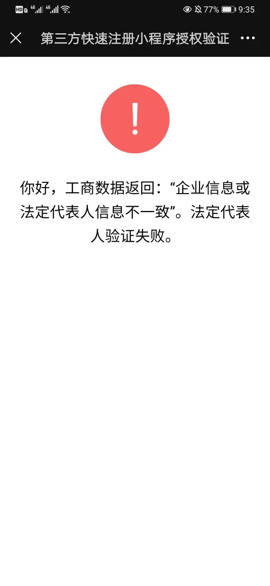用户在我们的第三方平台项目上快速注册小程序,企业信息和法人信息都是填写正确,法人微信收到人脸验证的消息,但是人脸验证之后就提示失败,请求帮助