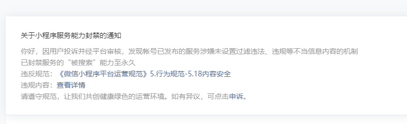 你好,小程序申诉将会7个工作日内审核完毕,请留意站内信申诉结果。
