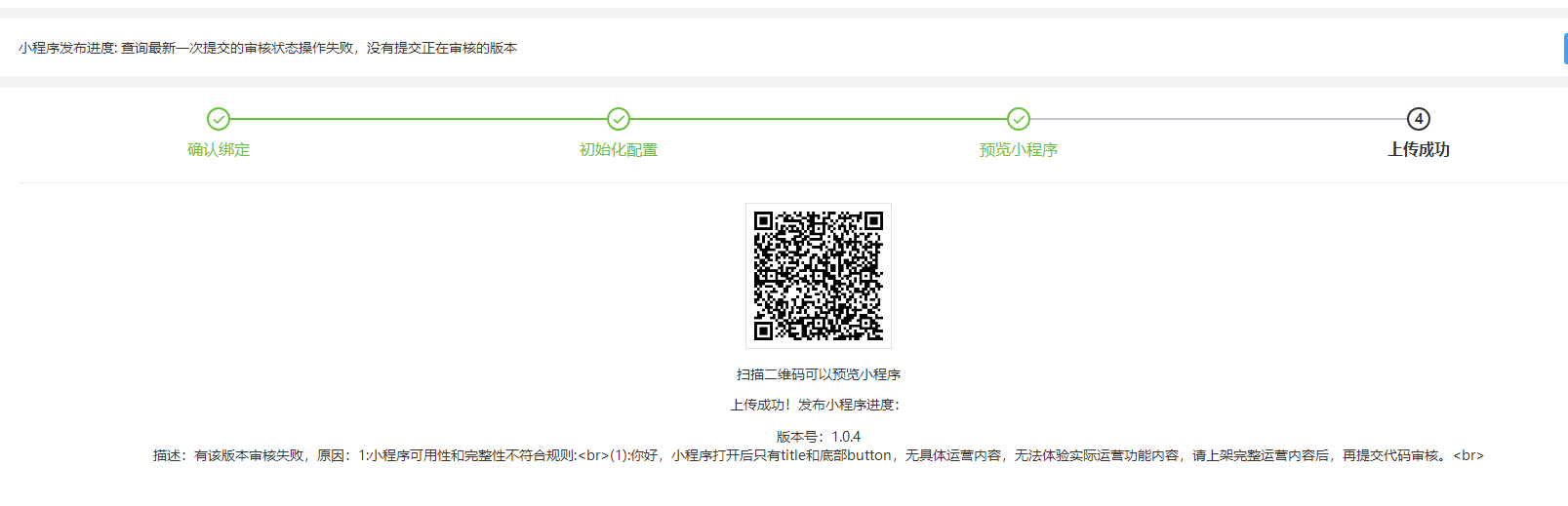 描述:有该版本审核失败,原因:1:小程序可用性和完整性不符合规则:<br>(1):你好,小程序打开后只有title和底部button,无具体运营内容,无法体验实际运营功能内容,请上架完整运营内容后,再提交代码审核。<br>