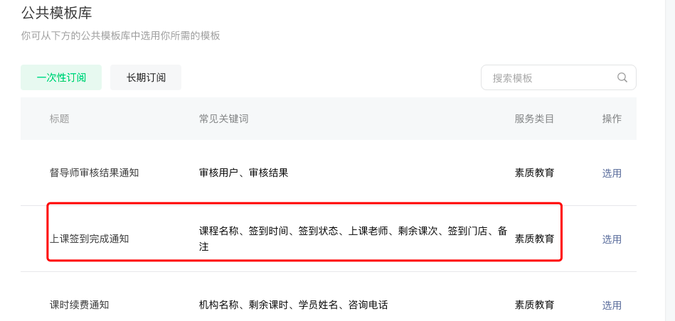 我我们是培训机构,用户在我们的小程序购课后,会给用户在微信下发每次上课通知、每次请假信息、签到通知等,这个如何可以实现?我看一次性订阅消息里有模板,但像上课通知这种需要多次下发给用户的,不知道如何实现,是否有大神指教~~
