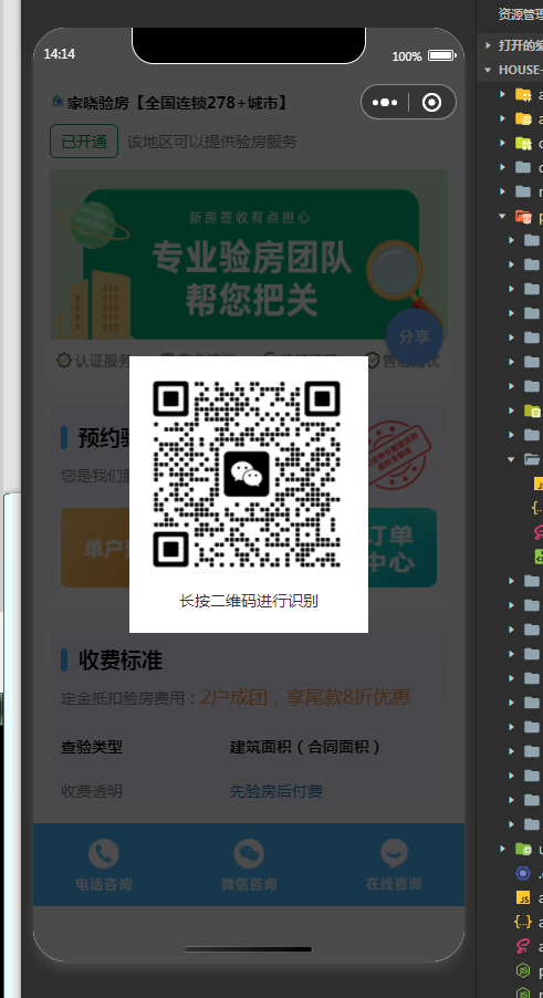 这是报错页面,正常点击那个微信客服是会弹窗二维码的,现在突入就用不了,版本一直没有更新还是之前的代码,然后打开打开环境的时候就正常,如下,,真机调试时,就不行,如下图所示,小程序:wx01f361f0e90ccc4e