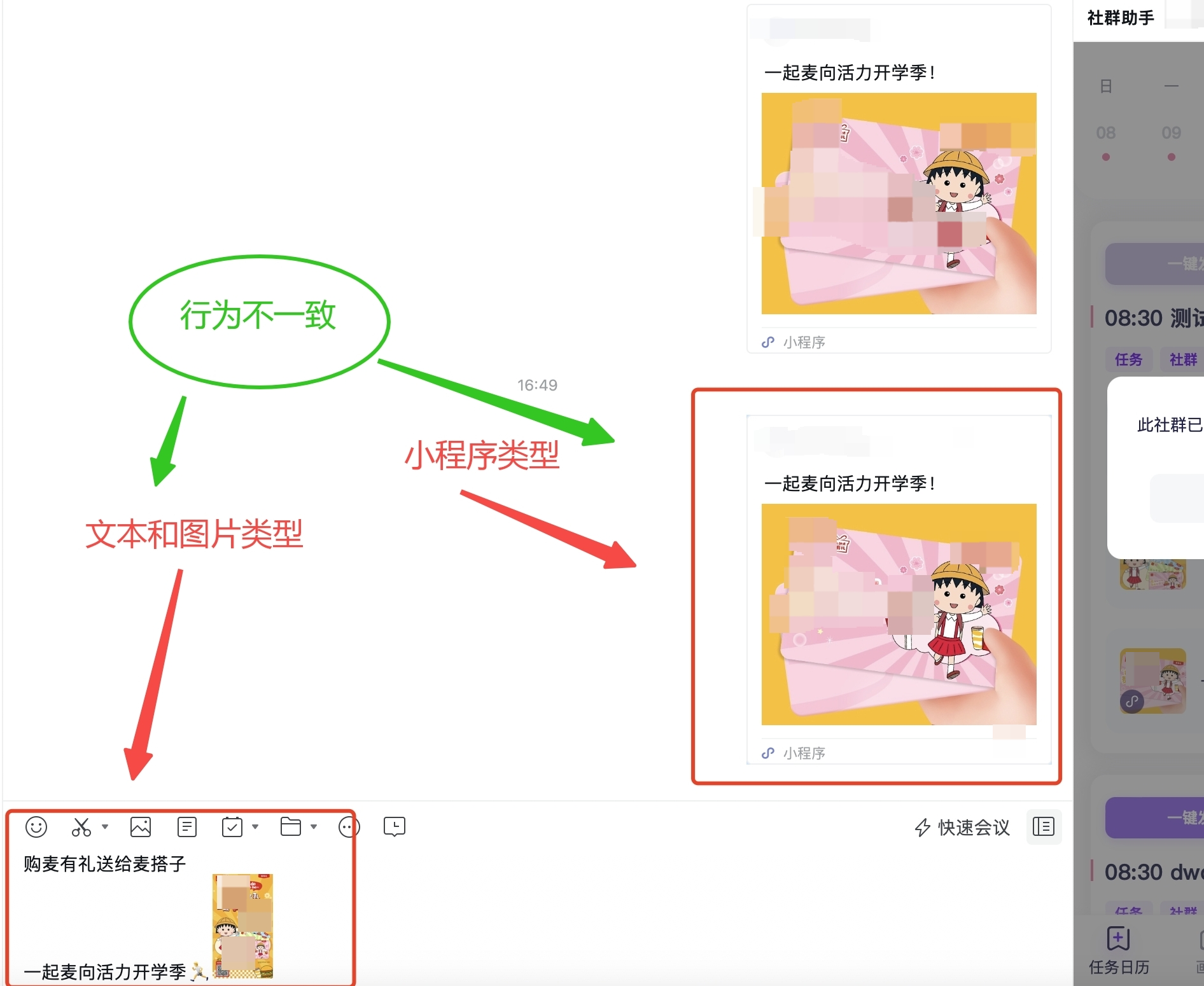 为何 企业微信MAC端从聊天侧边栏发送小程序,调用 sendChatMessage 方法,小程序类型会直接发送会话,而文本和图片类型则不会(文本和图片类型 是将内容粘贴在输入框中),行为不一致。