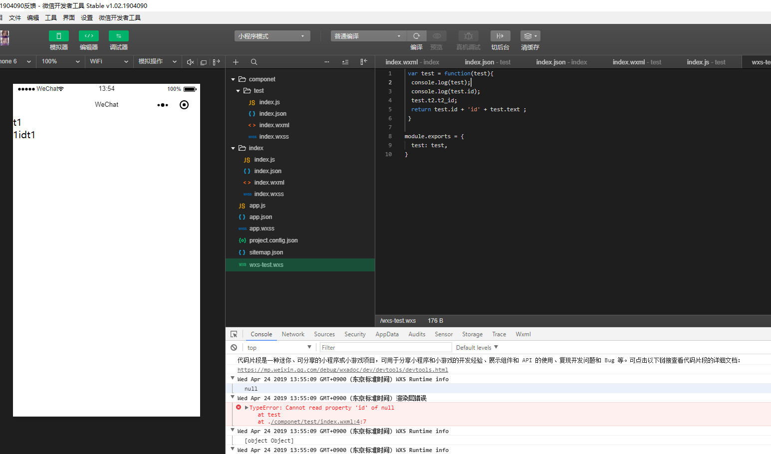 今天升级到1.02.1904090这个版本后,以前的wxs文档都不会报错,但是这个版本会因为wxs,会在数据传递之前先运行一遍,导致我所有的在wxs方法里面的方法全部报错Cannot read property 'id' of null 我检查之后发现是因为wxs会优先运行,导致了产数还没有传递进去的时候就跑了业务代码,结果报错。现在在wxs文件中每个方法中添加判断没参数的时候返回,有参数的时候在跑。
