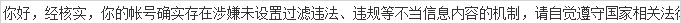 你好,经核实,你的帐号确实存在涉嫌未设置过滤违法、违规等不当信息内容的机制,请自觉遵守国家相关法律法规,不从事违法或违反《微信小程序平台运营规范》及相关规则的内容和行为,谢谢。 |