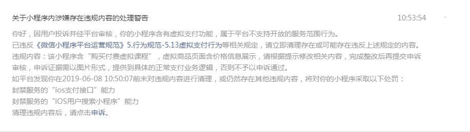 官方你好,你说的已反馈是通过什么渠道告知我们的呢?暂时没有看到小程序有新通知诶。我们周五重新发了新版,已经把所有可能涉及到虚拟支付的都下掉了,因为今天就是警告的deadline,所以想知道现在处理的进度是?以下是最新的帖子链接,多谢!