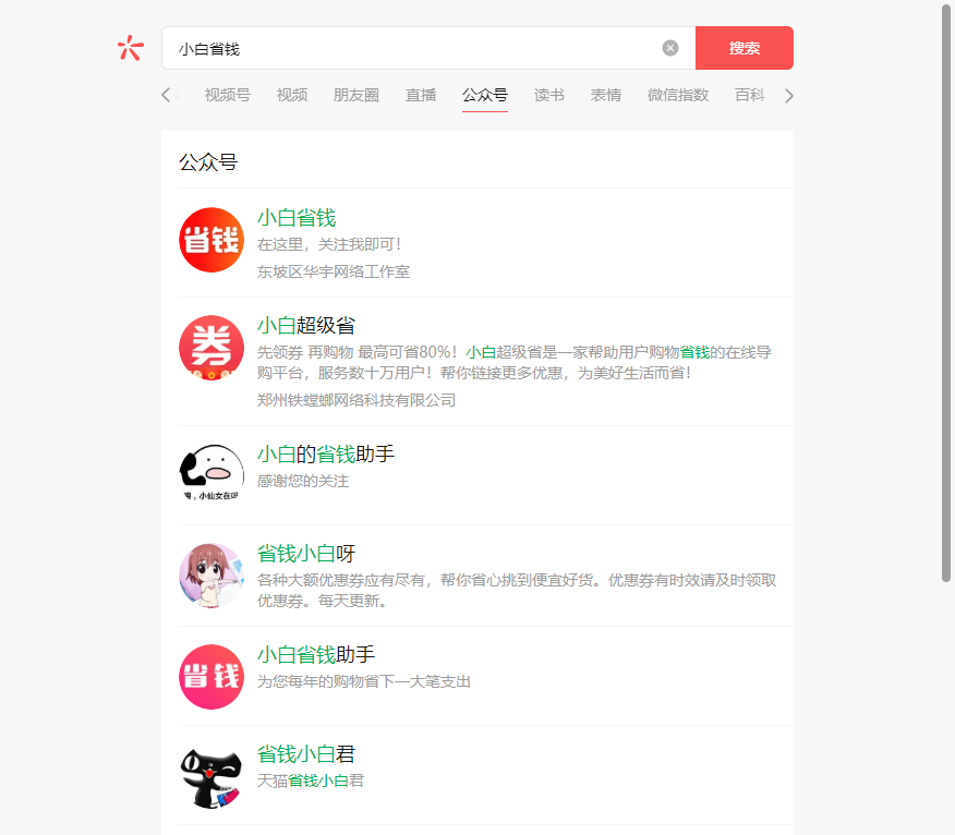 搜索公众号全称,全部列表不显示,麻烦处理一下,公众号名字:小白省钱 原始ID:gh_dc3cd7d96247