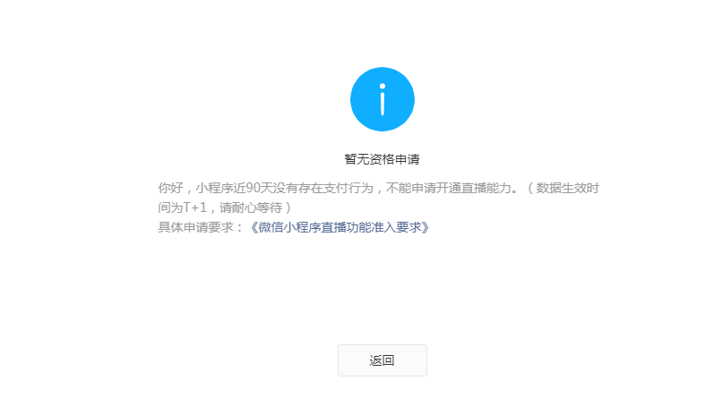 你好,小程序近90天没有存在支付行为,不能申请开通直播能力。(数据生效时间为T+1,请耐心等待)