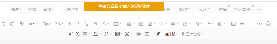 在135编辑器完成的推文,推文使用了2个svg,导入推文到微信公众平台后台时,显示最多插入500张图片,然后无法成功保存,实际使用的照片没有超过500张,通过135编辑器“保存同步”的功能可以保存到公众号后台,但是通过“导入文章”和“插入同步”的方式都不行,目前没有公众号授权的情况下,应该如果保存这个推文?