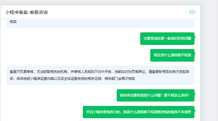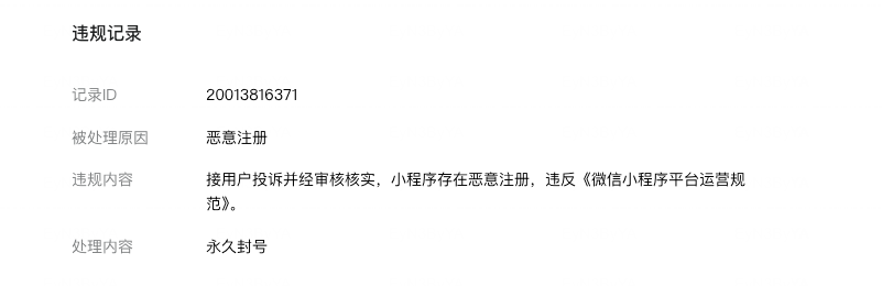 小程序个人开发者也太难了吧,我发布了小程序,花了钱做了微信认证,然后告诉我被投诉恶意注册被永久封号,关键是,注册提交规范里的5项,我到底违反了哪一项?也没有明确的指出说明,连整改的机会都没有,那我以后怎么知道我要怎么避免这个问题?那我花钱做认证是干嘛?撒币吗?收钱不办事,再申请一个小程序,再模棱两可的封掉,原来付费认证可以养活一家公司啊!退钱!
