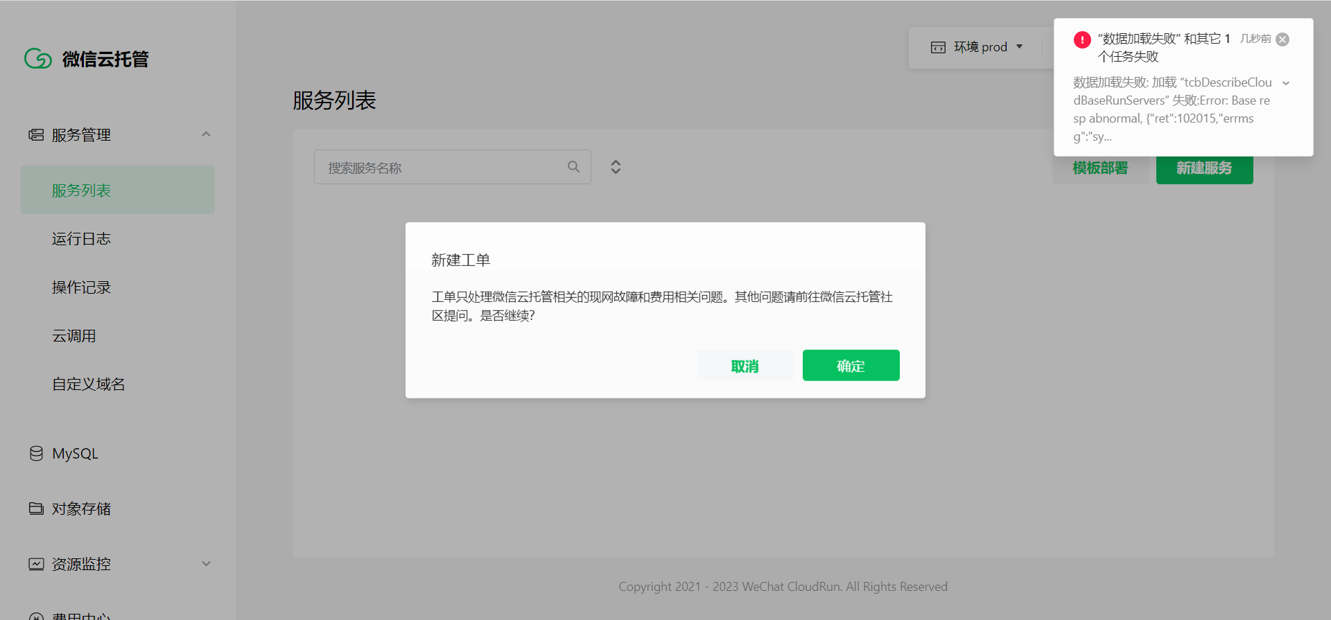 我的小程序因为云托管的后台报错打不开。但现在云托管页面打不开,无法排查,又发不了工单,联系不到客服