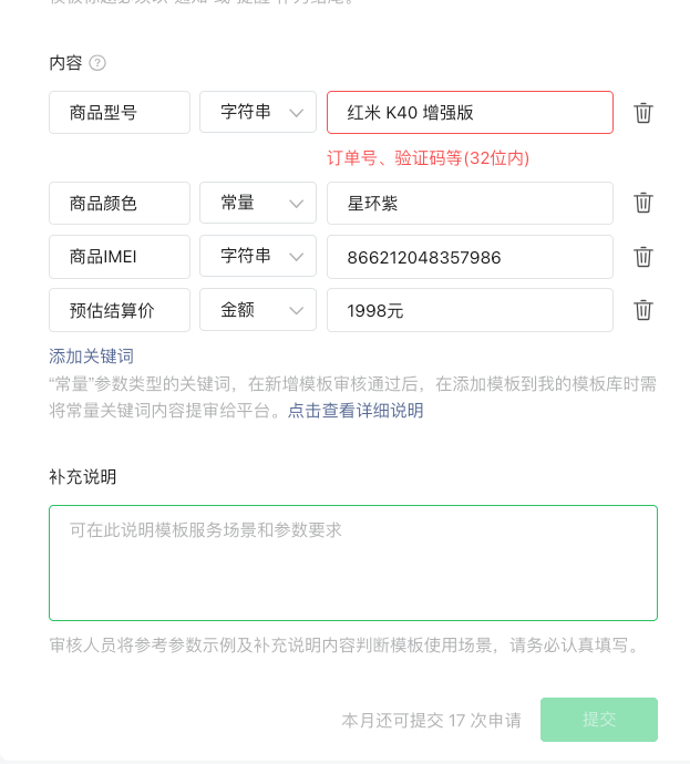 模版审核不通过的理由是商品型号属于字符串,但是选择字符串后,表单校验都不能通过,脑子??