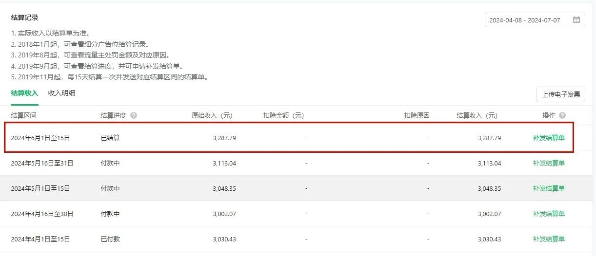 4月下至6月上一共4笔结算申请,已在电子发票后台上传了发票并审核通过。